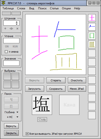 JiPad появился в версии ЯРКСИ 7.0 как альтернатива поиску по радикалам. Он располагается в главном окне
